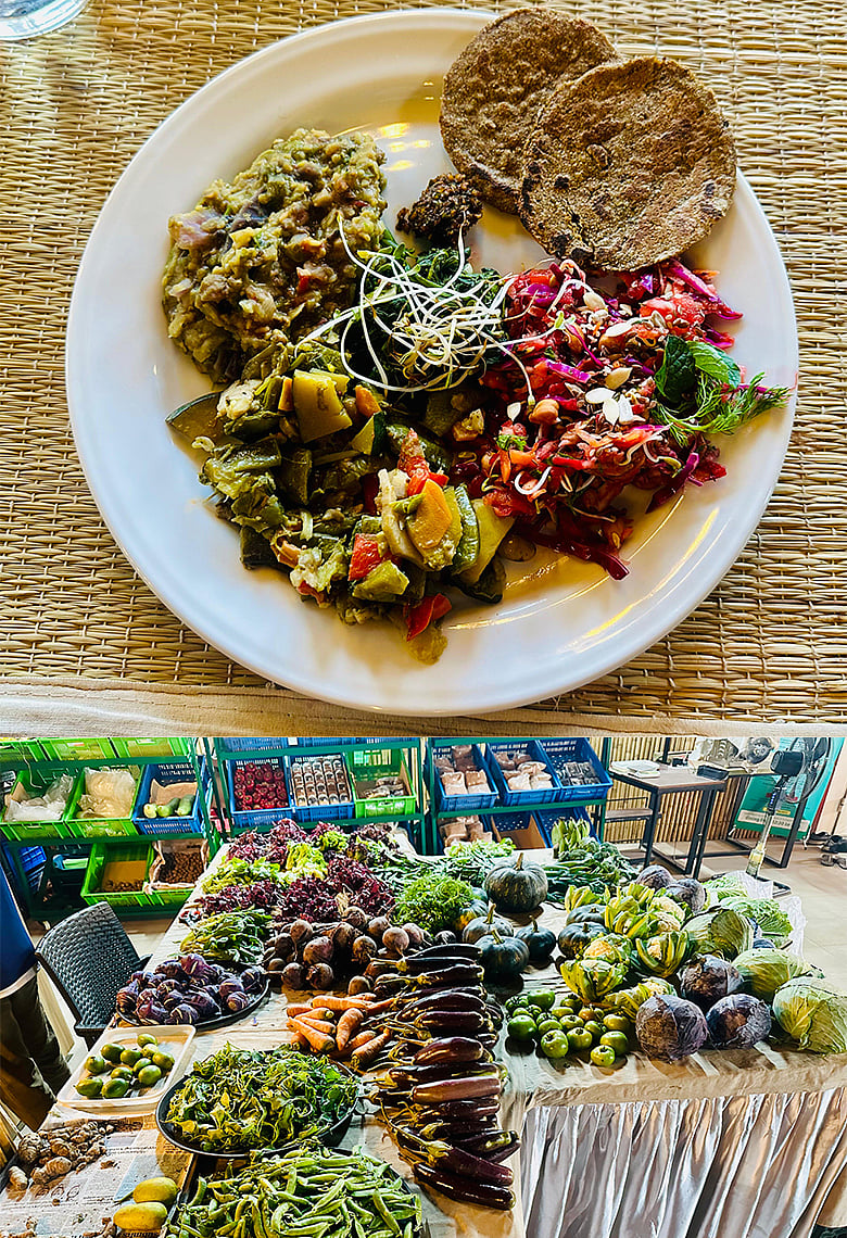নাহিদ পারভিন, যিনি হেঁশেলের ব্যবস্থাপনার দায়িত্বে আছেন, তিনি বলেন, এই রান্নার শুরুটা আসলে জমি থেকে। যে জমিতে কোনো রাসায়নিক সার বা কীটনাশক ব্যবহার হয় না, অন্য কোনো দূষণও যার কাছে পৌঁছায় না, সেখান থেকেই আসে সবজি। শীতকালের নানা রকম সবজি, অনেক অচেনা শাক, এমনকি বেগুনি রঙের মিষ্টি আলুর মতো বিরল উপাদানও রান্নায় নিয়মিত ব্যবহৃত হয়। এসব সবজি দিয়ে তৈরি হয় সালাদ আর ম্যাশ করা শাকসবজি মিশিয়ে বানানো হয় জবের আটার রুটি। রান্নায় তেল নেই, ভারী মসলা নেই শুধু পেঁয়াজ, কাঁচা মরিচ, ধনেপাতার মতো স্বাভাবিক উপাদান। তাঁর ভাষায়, “এখানে খেলে তবেই বোঝা যায় তেল-মসলা ছাড়াও খাবার কত সুস্বাদু হতে পারে।”